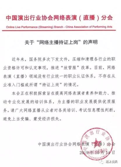 10月14日,中国演出行业协会网络表演(直播)协会通过官方微博发出声明,称:“目前,网络表演(直播)领域没有行业统一的职业认证体系,不存在从业准入门槛或‘持证上岗’的情况”。还提醒说,“请广大网络直播从业者对各类培训、考试信息理性判断,避免上当受骗、蒙受经济损失”。