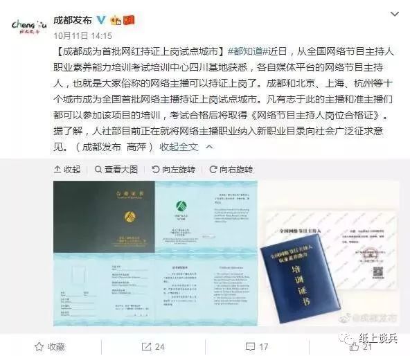 10月11日,据微博“成都发布”消息报道,近日,全国网络节目主持人职业素养能力培训考试培训中心四川基地透露,各自媒体平台的网络节目主持人,也就是大家俗称的网络主播可以持证上岗了。成都和北京、上海、杭州等十个城市成为全国首批网络主播持证上岗试点城市。凡有志于此的主播和准主播们都可以参加该项目的培训,考试合格后将取得《网络节目主持人岗位合格证》。