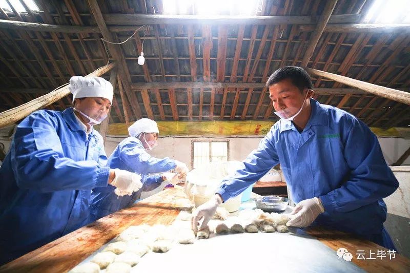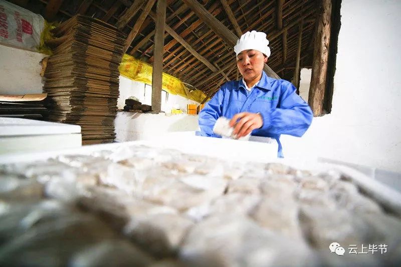 在贵州省毕节市大方县对江镇龙场村大山深处的豆香源食品厂,胡从锋(右)在和村民包豆干