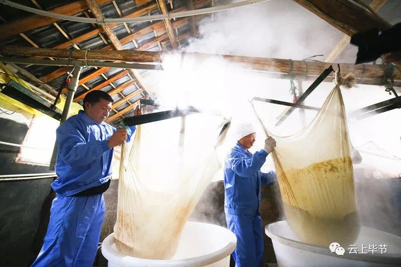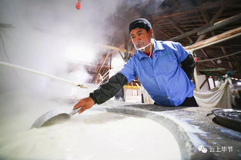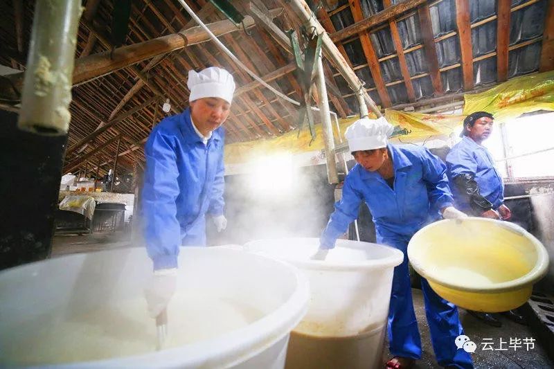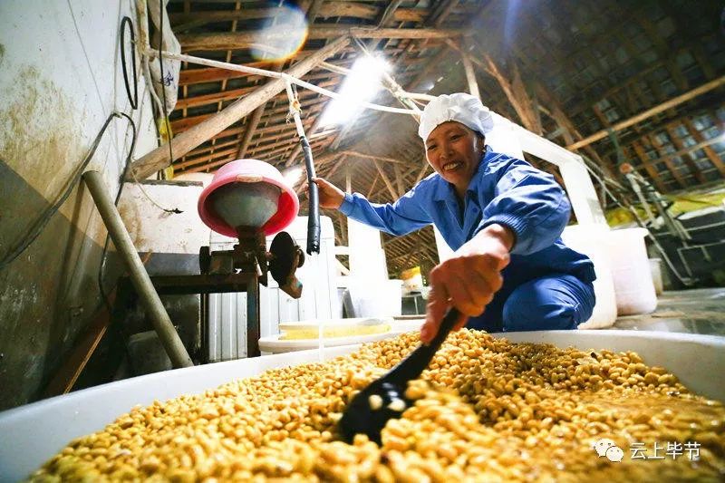 大山深处的豆香源食品厂里,村民正在给豆浆“点酸水”,让豆浆变成豆腐