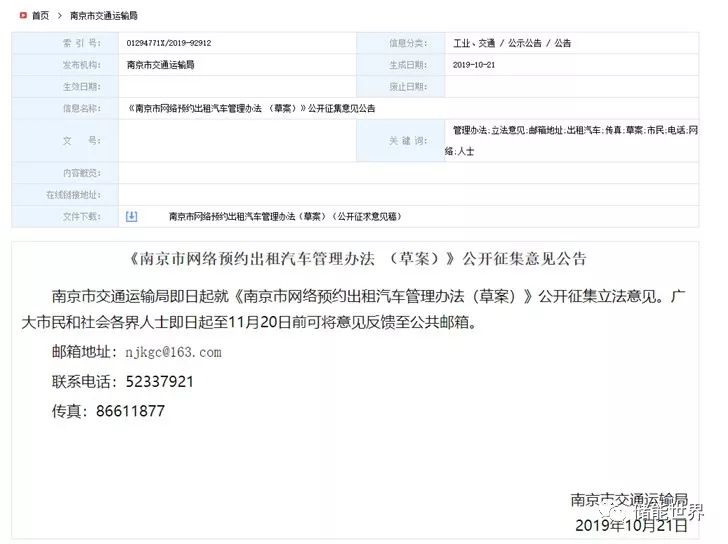 10月24日消息,10月21日,南京市交通运输局在官网上发布了《南京市网络预约出租汽车管理办法》公开征集意见公告。目前南京对网约车的管理参照的是2017年实施的《南京市网络预约出租汽车管理暂行办法》。此次拟出台的网约车管理办法属于政府规章,法律效力更强。