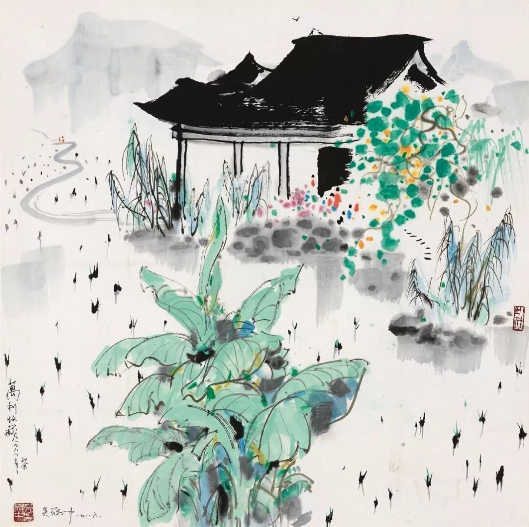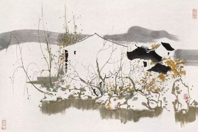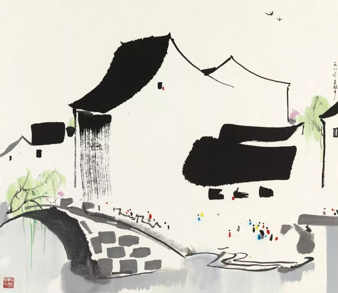 从绘画语言上来讲,吴冠中作品中的抽象点、线、面和色彩的形式是始终一以贯之的。或多或少或色彩不同的点,在其画面上因位置和大小差异从而形成了千变万化的画面内涵,点在吴冠中的画面中已经精炼成了纯粹的视觉符号。线在中国画中是最重要的造型表现手段,吴冠中对线有着异常的敏感和喜爱,他在作品中大量使用线来抒发情感和描绘意境,或纤细长线,或环绕曲线,或体量复线,或洒脱单线。线是他画面的“骨",是画面的"魂”。面在吴冠中作品中也多以抽象的形式呈现,他以蒙德里安“平面分割的意识"强化了中国画中"经营位置"的构图观,推敲画面中黑、白、灰之间的关系,强调中国画中的“留白",把中国画技巧与西方画技巧完美相融。