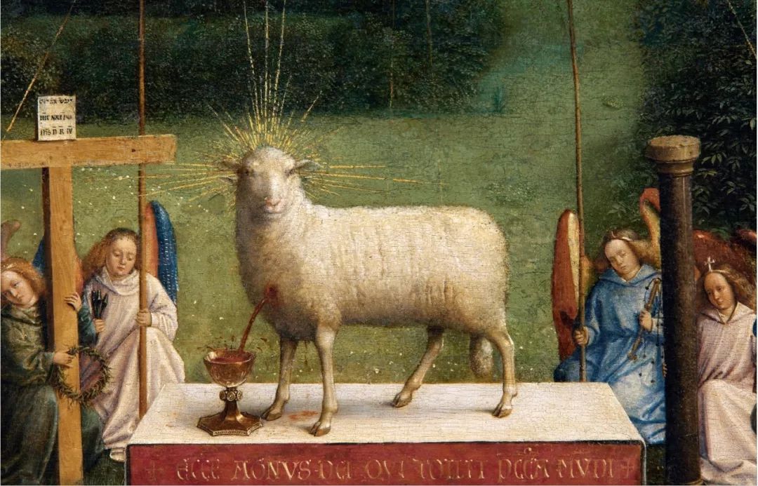 《根特祭坛》是最早的大型油画之一,是为现在的比利时根特的圣巴沃大教堂创作的。在《根特祭坛》组画的中心是基督作为神圣的羔羊的血流进高脚杯的象征——传说中的圣杯。