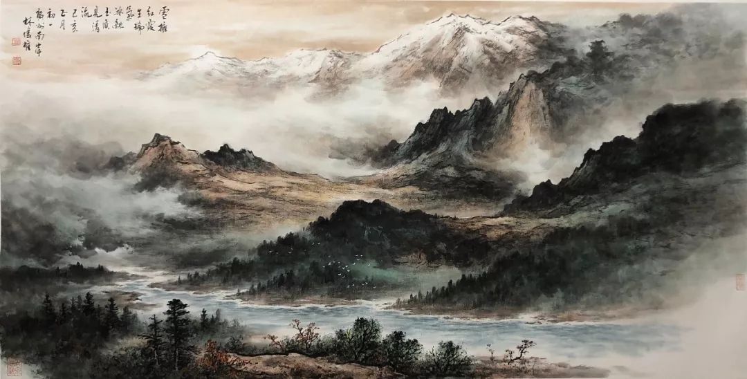 林伟权虽为岭南人,却心仪西部川藏地区的大山大水,川藏地区的雪山、河流给了他灵感的启迪,这种雄浑、苍茫与神秘的西部山水风情给了他灵魂的共鸣;画家被眼中和心中感受到的世间所吸引,他用虔诚皈依般的心态面对大自然,用自己创造的山水意象,表达他对雄浑、苍茫和神秘境界、美感的向往、追求和热爱。画面中的情景、境界、氛围与笔墨、色彩,也因此呈现出一种绵长的力量。