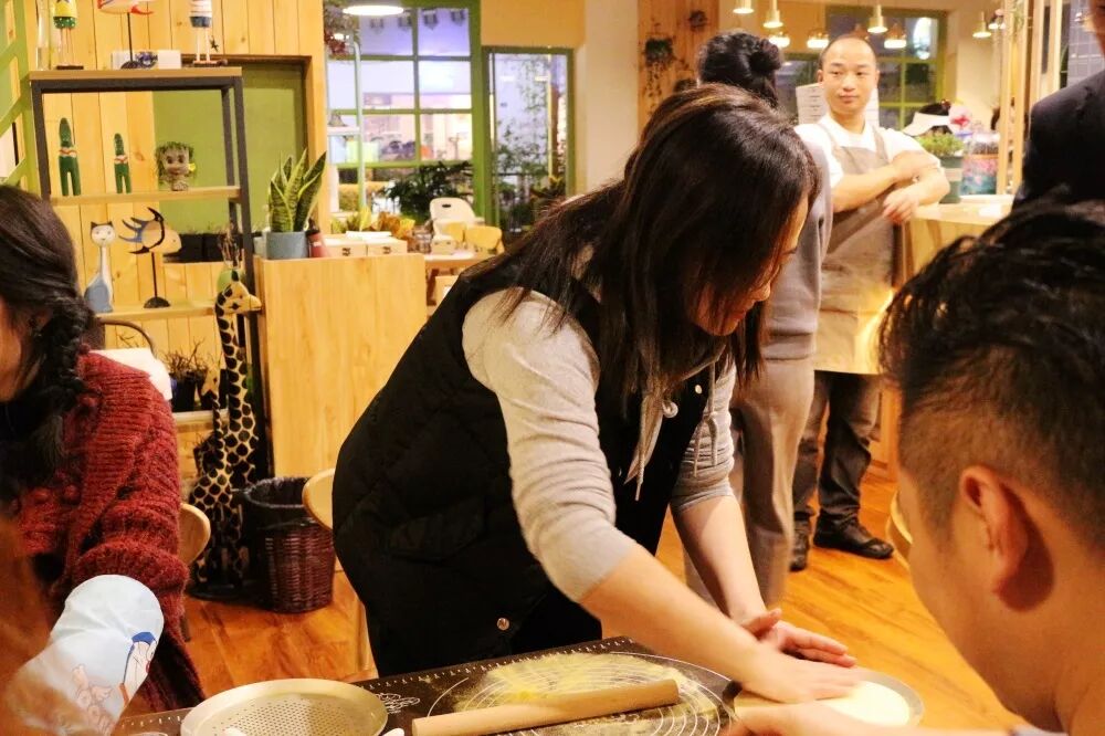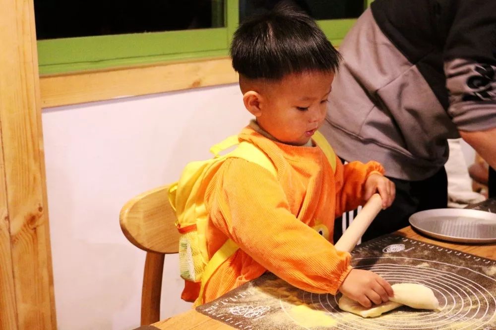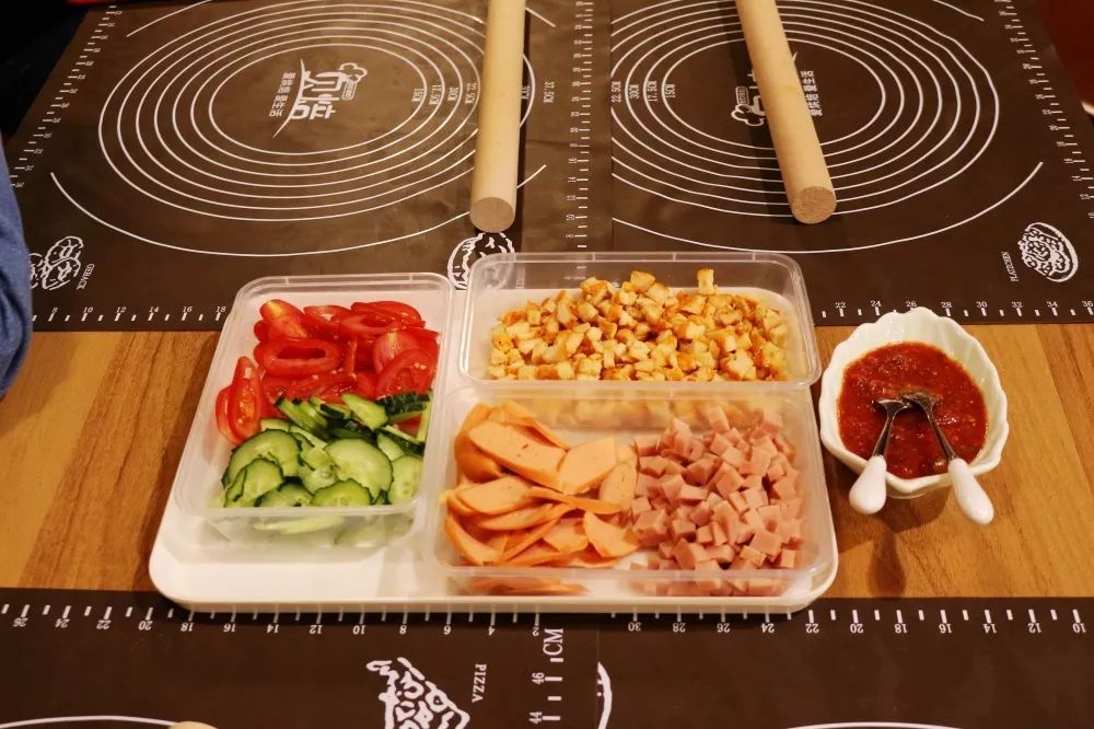 窗外阴雨绵绵,屋内的小伙伴们却热情高涨,一个个在揉面的过程中挽起了袖口,额头沁出细密的汗珠。在老师的指导下,完成了披萨饼的制作。