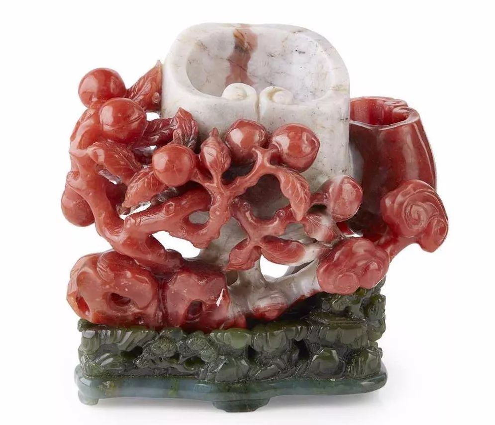 Lot 107: AGATE 'LINGZHI' BRUSH WASHER WITH JADE BASE LATE QING DYNASTY-REPUBLIC PERIOD, 19TH-20TH CENTURY