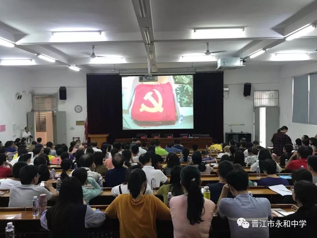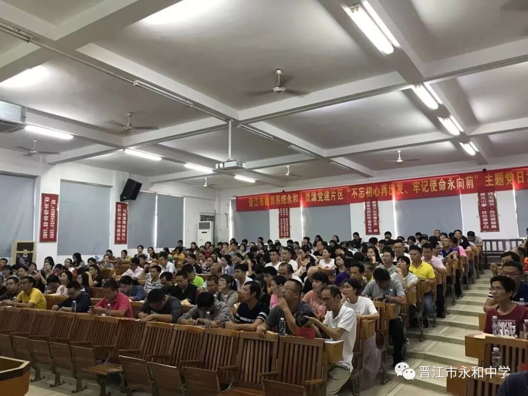 近日,为贯彻落实党的十九大精神,贯彻落实市委、市局相关学习要求,严格规范党内政治生活,永和、灵源党建片区各基层党组织联合开展了以“不忘初心再出发、牢记使命永向前”为主题的党日活动。会议在永和中学党支部傅灿辉书记的主持下拉开序幕,全体党员共同观看了学习视频《面向世界的中国共产党》,明确了中国共产党人的初心和使命,一起聆听了晋江市委党校社科研究室洪荣福主任的《守初心、担使命,共创中国新辉煌》的精彩讲座。讲座结束后,晋江市教育系统党建第十组组长吴海山同志还进行了学习交流指导,随后各位党员展开了热烈的讨论,找差距,谈落实,把本次主题党日活动推向高潮。