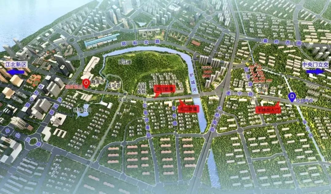 工程起于建宁路与热河路交叉口以东,以双向4车道隧道形式接建宁西路过江通道工程,沿建宁路向东穿越仪凤门后,在北祖师庵路东侧设置一对进出口匝道,主线隧道继续向东穿越护城河、大桥南路和四平路,在金川河西侧出地面接入现状建宁路,全长约1.62公里。