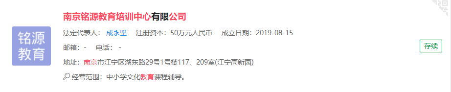 芝麻街英语南京江宁创意工厂校区刚刚开业几个月,甚至连公司注册成立也仅仅2个月的时间。公司名为“南京铭源教育培训中心有限公司”,于2019年8月15日成立。