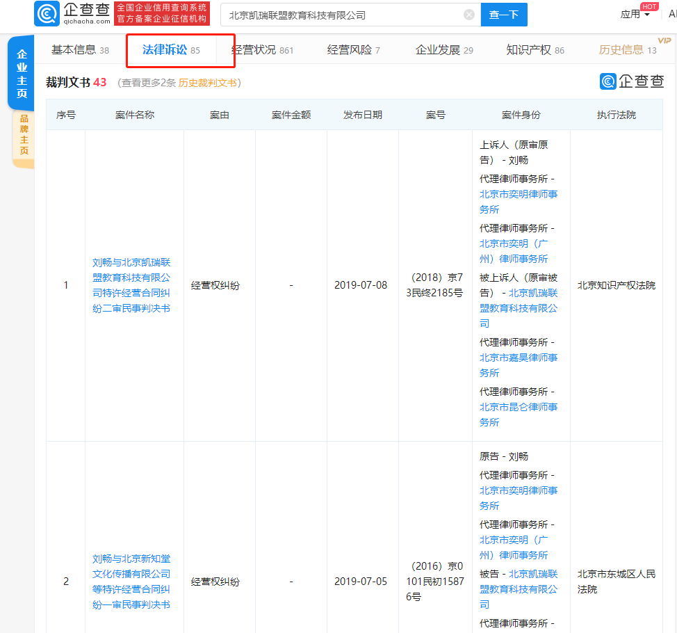 有媒体曾报道,北京凯瑞联盟教育和加盟商发生多起经济纠纷案件,高达85起,甚至仅仅是今年就已经有12起诉讼纠纷,且纠纷事项均为“经营纠纷权”。