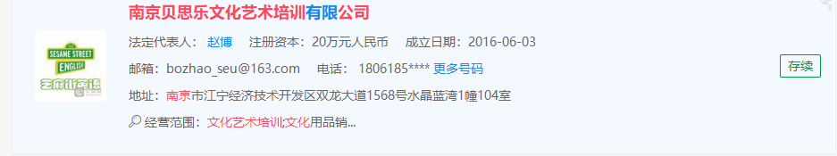 实际上,这家芝麻街英语百家湖店并不是直营店,而是一家名为“南京贝思乐文化艺术培训公司”开办的加盟店。