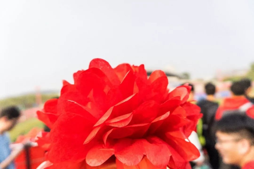 最后全场起立挥舞手中的红旗和花球,