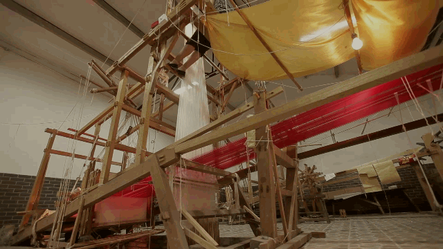 由于“妆花”织艺过于复杂,直到现在,这种技艺还无法完全用现代机器替代,还是必须在大花楼木质提花织机上,由上下两人配合操作才能完成。这种操作劳动强度大、工艺水平高,一天仅能生产5-6厘米,一件皇帝的龙袍最快都要织三年,因此云锦才有“寸锦寸金”之名,“南”啊!