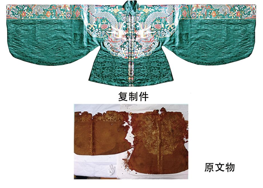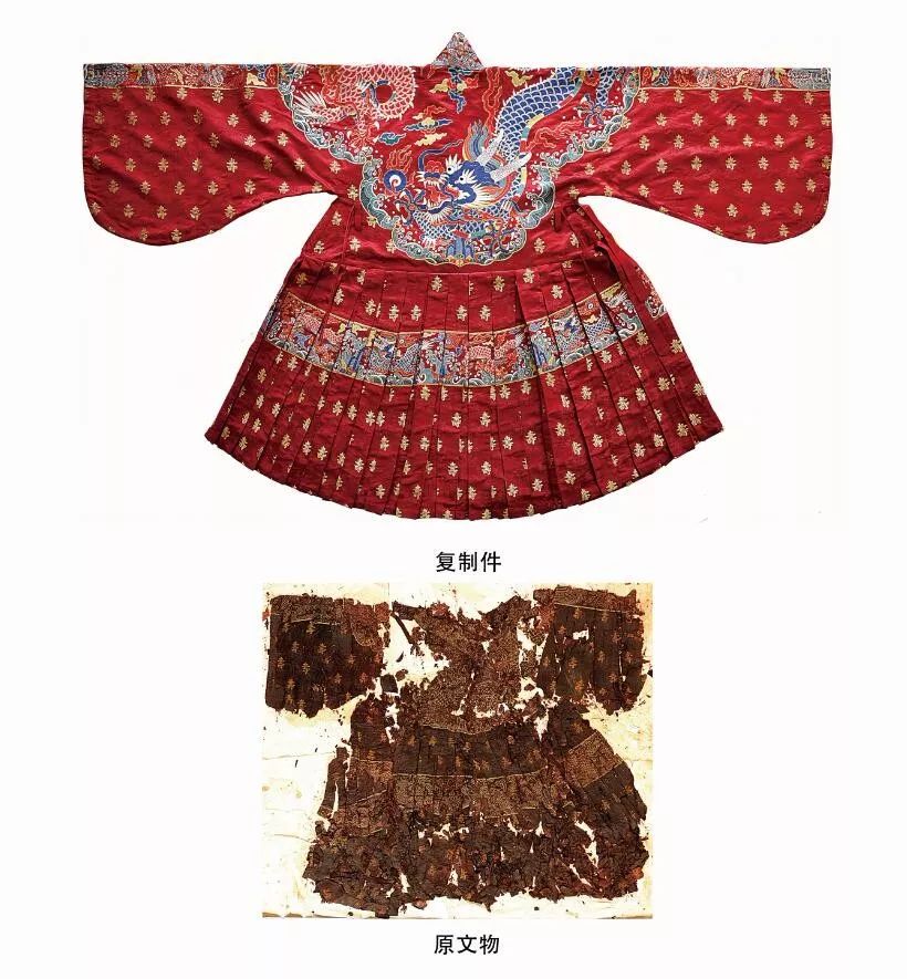 这件夹衣出土于孝端后棺内中部,妆花部分纹样造型生动、线条舒展流畅,织造难度较大。整件女衣设色极为精妙,布局匀称协调,巧妙运用了同类色的深浅晕色技法和大量使用片金线,富丽辉煌。