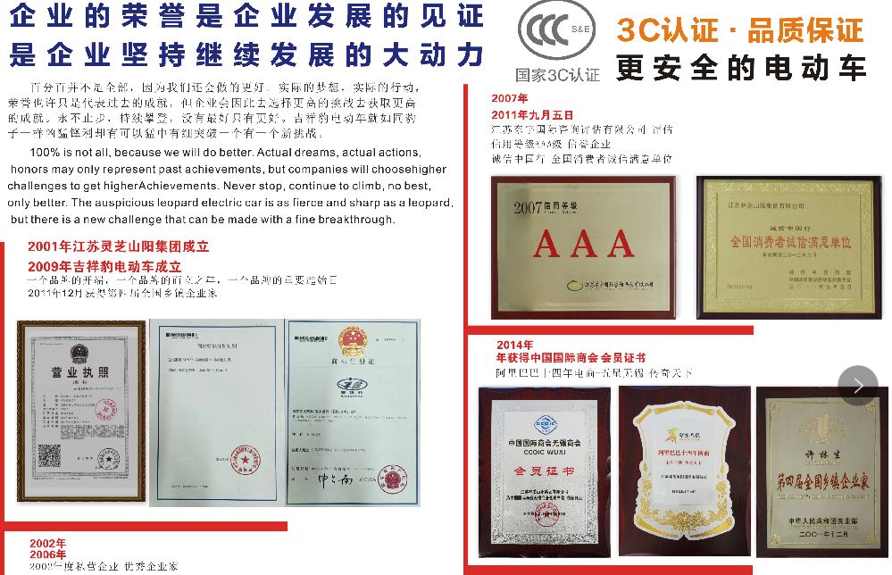 创新品打造差异化竞争吉祥豹不断创新,打造产品差异化竞争。行业第一:更安全的刹车,吉祥豹电动车是行业内第一个启用铜基冶金刹车(高铁专用)设计理念的。是最为耐用、耐磨、耐高温的刹车系统。历经十万次高速刹车试验,刹车片仅有轻微磨损!并且,吉祥豹的铜基冶金刹车片终生免费质保!电动车消费者的第二需求:跑得远,在电量、放电电流相等的条件下,如何跑得更远?靠电机制胜!所以,电机也是整车中最为关键的零件。新电机采用日本高科技材料(保密)研发而成超级电机,目前只有吉祥豹公司等极少数厂家使用里程王专利技术。目前60/20A的电池续航里程已经超过100公里,72/30A电池的续航里程更是达到180公里以上。目前,公司正计划将吉祥豹所有车型均推出长跑王系列!
