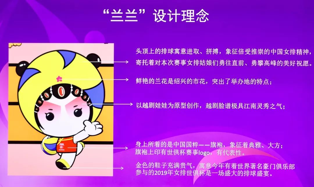 据组委会介绍,以越剧娃娃为原型的兰兰头顶着排球,象征备受推崇的中国女排精神,寄托了对本次赛事女排姑娘们勇往直前、勇攀高峰的美好祝愿;作为绍兴市市花,兰花也被融入了设计之中,不仅极具江南灵秀之美,也突出了绍兴特点。此外,兰兰身上还穿着一件印有世俱杯的logo的旗袍,透露着典雅大方的女性之美。