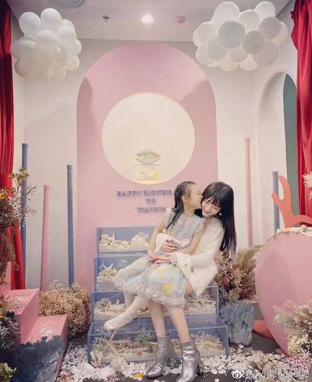 甜馨生日会现场布置的非常温馨,粉红色的设计十分符合女孩子的喜好,现场充满了小公主喜欢的装饰品和道具,看来妈妈是很用心为女儿设计布置了。李小璐抱着女儿坐在透明阶梯上,甜馨开心地亲吻着妈妈的脸蛋,李小璐同样满脸幸福。