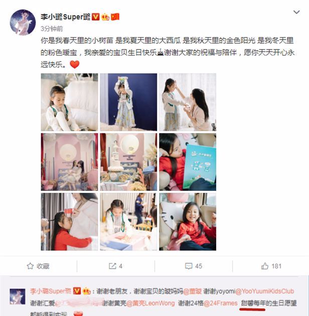 李小璐微博截图。李小璐还在评论区感谢了很多老友,并一一艾特他们,但是依旧没有和贾乃亮互动。早前,曾有爆料称李小璐为小甜馨改名为李美心,在和网友的互动中李小璐依旧称女儿为甜馨,可见她并没有为女儿改名,间接辟谣了之前的改名谣言。