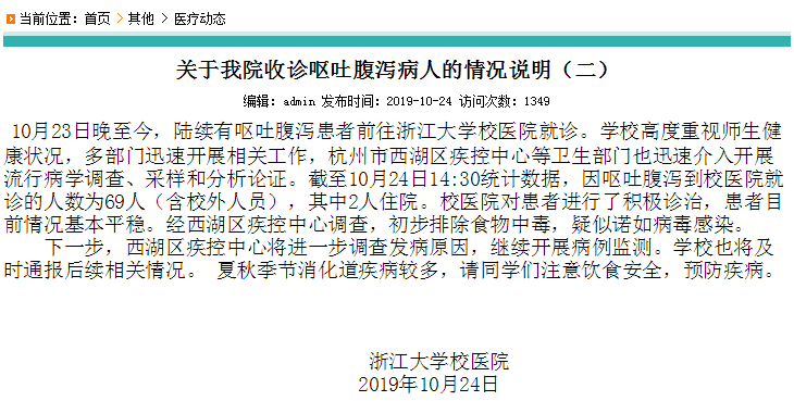10月23日晚至今,陆续有呕吐腹泻患者前往浙江大学校医院就诊。学校高度重视师生健康状况,多部门迅速开展相关工作,杭州市西湖区疾控中心等卫生部门也迅速介入开展流行病学调查、采样和分析论证。截至10月24日14:30统计数据,因呕吐腹泻到校医院就诊的人数为69人(含校外人员),其中2人住院。校医院对患者进行了积极诊治,患者目前情况基本平稳。经西湖区疾控中心调查,初步排除食物中毒,疑似诺如病毒感染。