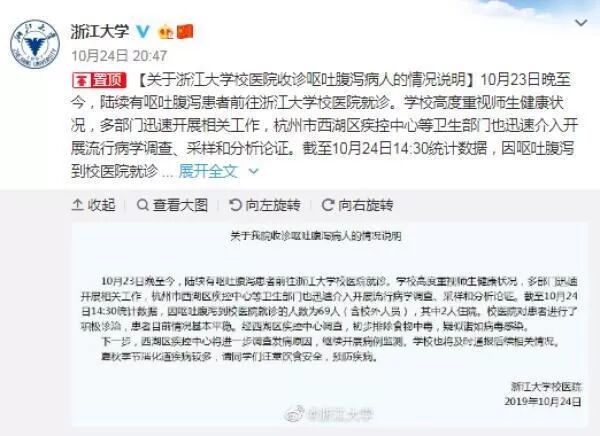 中国网10月25日讯 就浙江大学校医院10月23日至24日收诊呕吐腹泻病人一事,浙江大学官方微博10月24日发布通报称,截至10月24日14时30分统计数据,因呕吐腹泻到校医院就诊的人数为69人(含校外人员),其中2人住院。校医院对患者进行了积极诊治,患者目前情况基本平稳。经西湖区疾控中心调查,初步排除食物中毒,疑似诺如病毒感染。