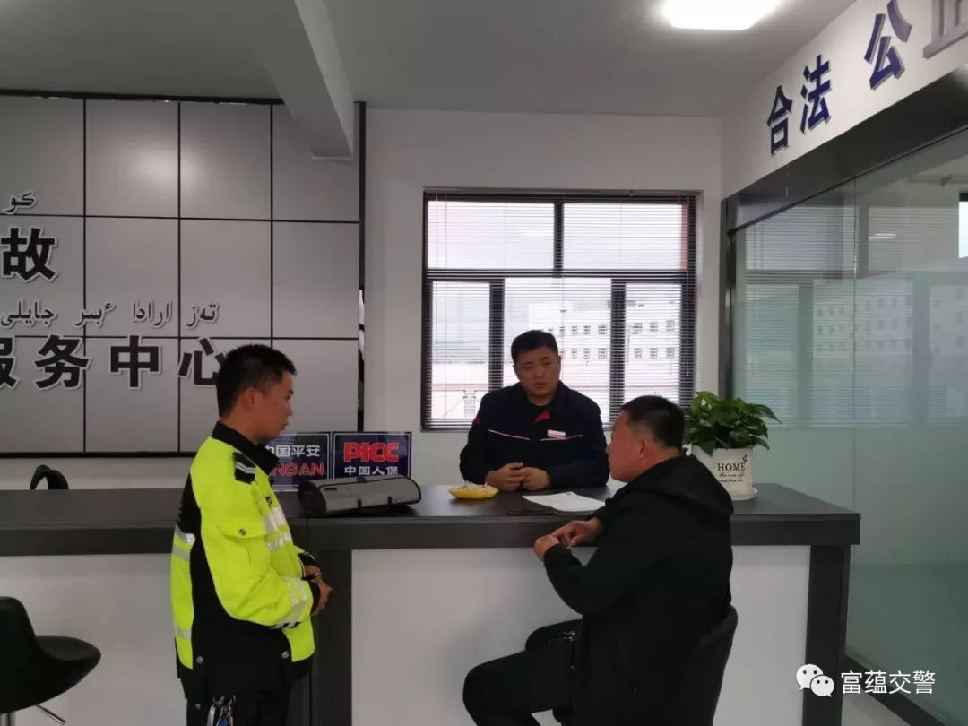 自“不忘初心、牢记使命”主题教育开展以来,富蕴县公安局交警大队认真践行对人民的承诺,扎实为群众办好事实事。针对富蕴县公安局交警大队驻地远、交通不便,群众办事不方便等问题,富蕴县公安局党委高度重视,积极安排部署相关工作,在局党委的协调下,以保险公司为主定点在万达汽修中心,成立了阿勒泰地区首家警保联动交通事故快处快赔服务中心,于2019年10月21日正式投入使用。