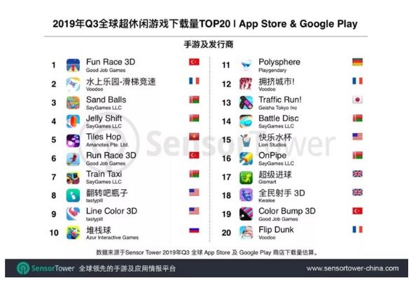 2. Sensor Tower:全球超休闲游戏TOP 20在Q3期间共获7.9亿次下载量