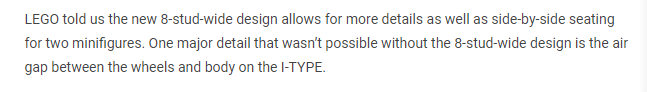 而且乐高已经确认2020年的竞速冠军系列将会采用8个积木宽度去设计新车。这样一辆车可以容纳2个小人并排坐。