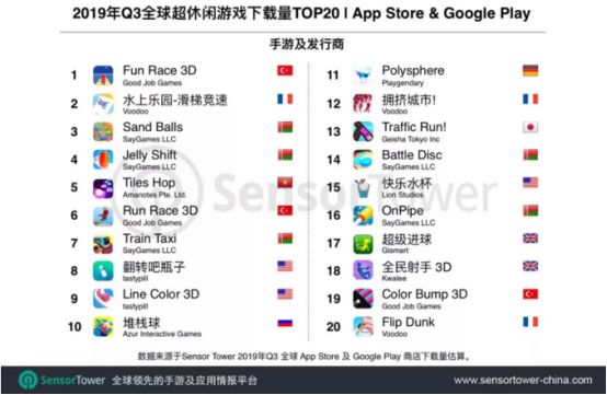 2、淘票票总裁李捷:网大更名为“网络电影”对平台、制作方提出更高的内容要求在中国网络电影周论坛上,阿里大文娱电影业务负责人、阿里影业高级副总裁、淘票票总裁李捷表示,“网大的时代过去了,这不只是改个名字”,网大更名为“网络电影”,对平台、制作方提出更高的内容要求,要对得起“电影”二字。李捷认为,网络电影是一条巨大的赛道,内容和产业十年或者二十年才出现这样的风口,优酷希望与从业者一起,共同创造网络电影的“六大”。(36氪) 3、腾讯音乐娱乐发布“内容共创”实践“TME+”24日,由腾讯音乐娱乐集团(TME)举办的“腾讯音乐娱乐盛典发布会”在京召开。TME CEO彭迦信宣布,首届腾讯音乐娱乐盛典(TMEA)定于12月8日在澳门举办。集团副总裁潘才俊发布了腾讯音乐娱乐集团在“内容共创”方面的实践“TME+”,即通过将“音乐+影视”“音乐+游戏”等跨界力量相结合,腾讯音乐娱乐集团已经成功推出了“制作+”“影音+”等多个项目,统称“TME+”。 4、Sensor Tower:全球超休闲游戏TOP 20在Q3期间共获7.9亿次下载量Sensor Tower商店情报平台最新数据显示,2019年Q3全球超休闲游戏下载量及收入排名TOP 20中,来自土耳其发行商Good Job Games 《Fun Race 3D》在全球App Store和Google Play共获得1.23亿次下载,位列下载榜榜首。这20款超休闲游戏Q3期间在全球App Store和Google Play总共获得7.9亿次下载量。(36氪)
