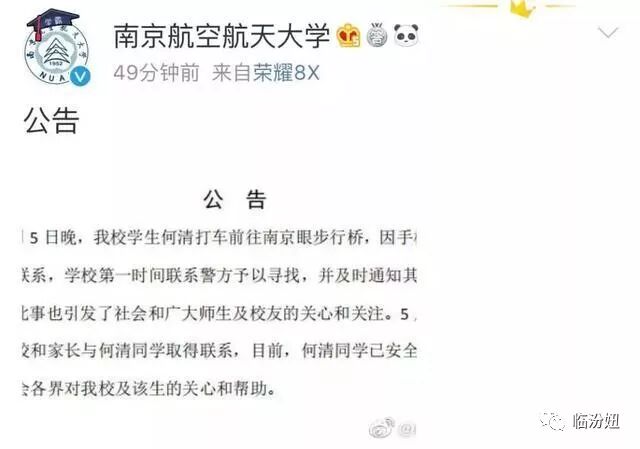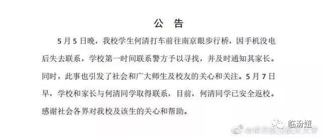 根据寻人启事信息,何清是晚上八点半离开南航江宁校区宿舍的,八点四十五上了滴滴网约车,九点二十到达南京眼步行桥,之后再没有任何消息了。