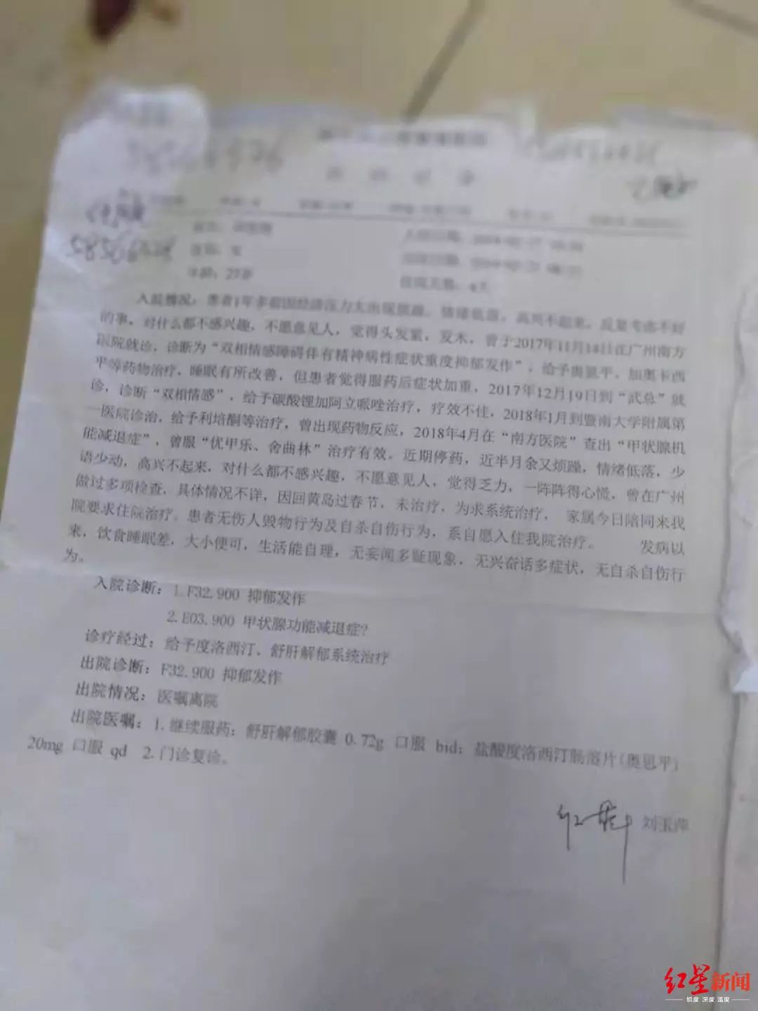 据南方医科大学南方医院2017年11月诊断显示:双相情感障碍伴有精神性症状重度抑郁发作。之后吴依然分别在“武总”、暨南大学附属第一医院、中山附属三院心理科就诊过。2019年1月,看完病后,吴女士决定把女儿从广州接回青岛家中照顾。
