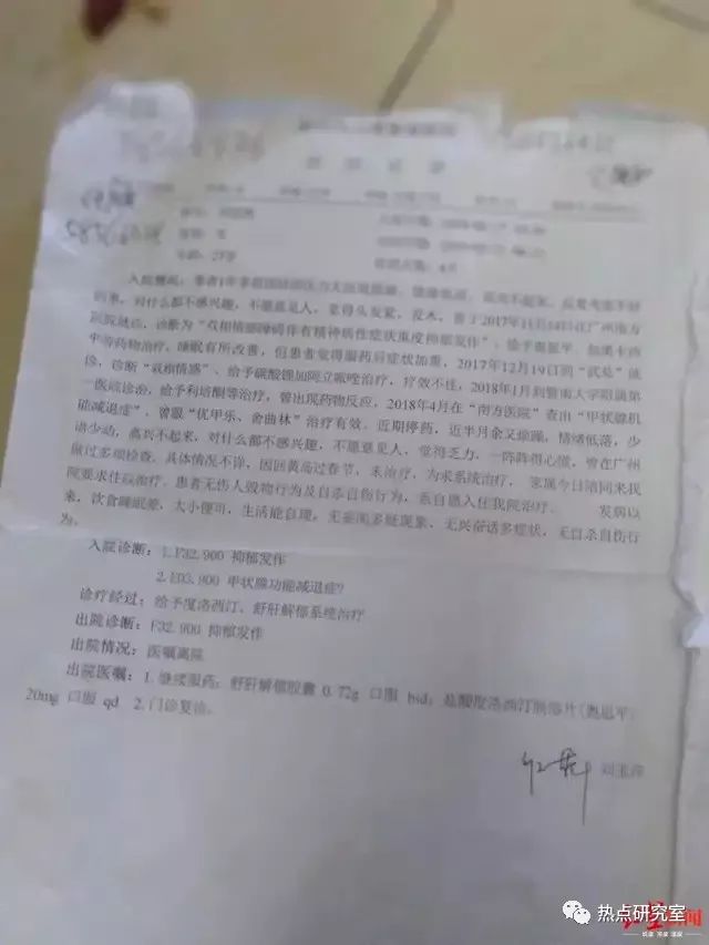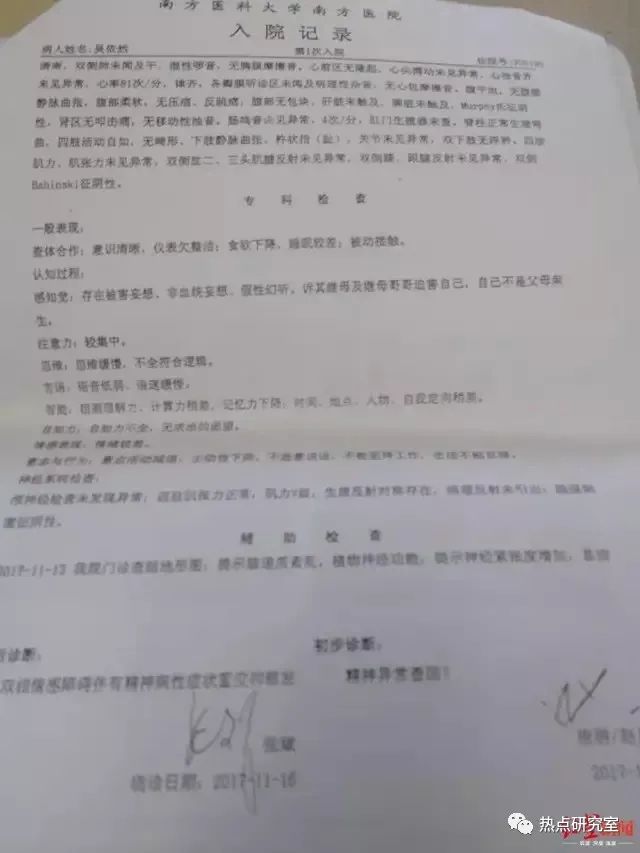 据南方医科大学南方医院2017年11月诊断显示:双相情感障碍伴有精神性症状重度抑郁发作。之后吴依然分别在“武总”、暨南大学附属第一医院、中山附属三院心理科就诊过。2019年1月,看完病后,吴女士决定把女儿从广州接回青岛家中照顾。