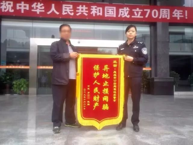 10月21日下午,受罗女士的委托,罗先生将一面印有“异地止损网骗,保护人民财产”字样的锦旗,送至恩施市公安局刑侦大队民警手中,对民警快速反应,及时止损表示感谢。