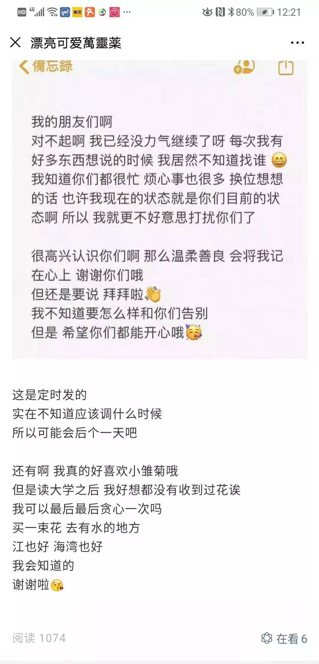据李某的同学反映,李某的个人公众号于23日发送了一条定时推送,推文中出现“自杀”“已经没有力气继续”等字眼。