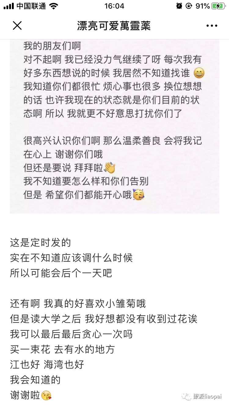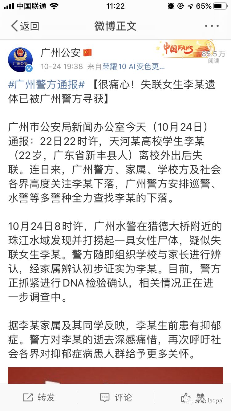 22日,暨南大学2017级戏剧影视文学专业一女学生李某失联,留下消极文字引发关注。24日,@广州公安 通报称,在珠江水域寻获一具女性尸体,经家属辨认初步证实为李某。据其家属及同学反映,她生前患有抑郁症。目前,警方正抓紧进行DNA检验确认,相关情况进一步调查中。