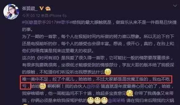 当《歌手》总导演洪涛发布最终排名时,张碧晨并没有流泪,而是大咧地呵呵笑,挨个拥抱一切歌手,以至在本应煽情、博眼球的时辰,秒变段子手:“我喜欢玩游戏,这个时分特别像我在下载游戏副本,一切的boss老怪都出来了。”这样的好意态,前一期《歌手》也是如此,唱着张学友《时间有泪》的张碧晨,那期也排名垫底。赛后,她发微博自嘲,本人的对手都是混世魔王级别的,即便垫底也不吃亏。