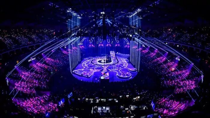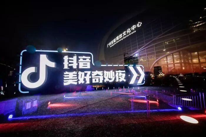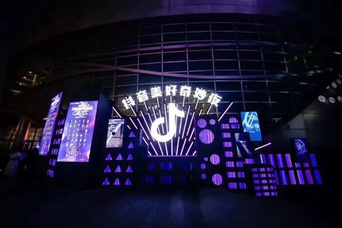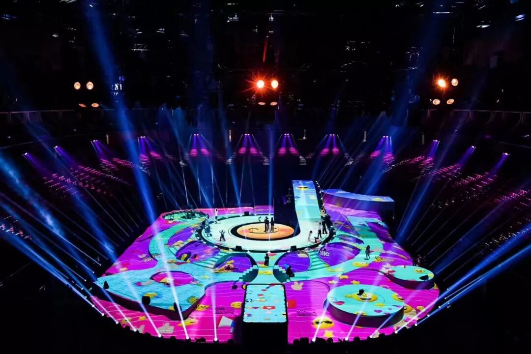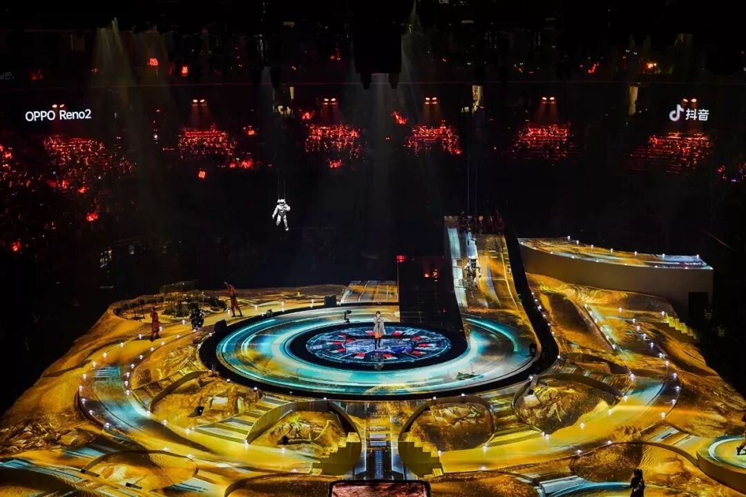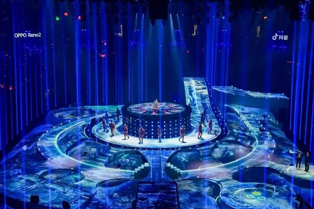 盛典晚会舞台创新采用了360°全景式舞台,将立体抖音Logo嵌入到舞台中央,结合LED地面屏幕,打造360°全景的视觉震撼效果。