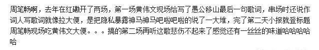 周笔畅去香港开演唱会,黄伟文当嘉宾,在现场作了几句词,说作词人写歌像排泄,大意就是把隐私情感暴露给观众看。第二天小报标题:周笔畅现场吃黄伟文大便。