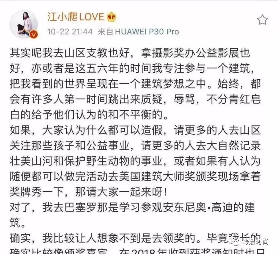 随后江一燕连忙发文澄清,但文不对题,咱们就事论事,做建筑跟所谓的做公益八竿子打不着,怎么就扯一块儿了。