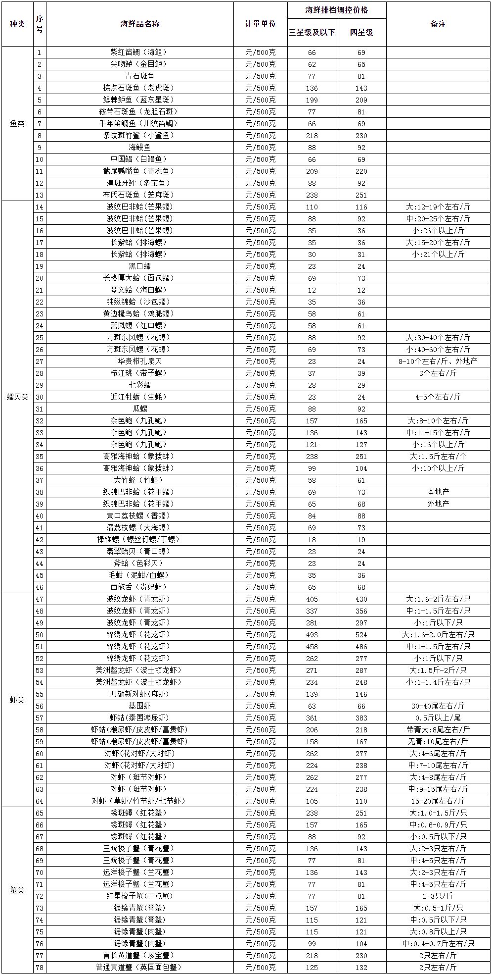 3、当各类海鲜品平均批发参考价超过以下上限(鱼类250元/500克、螺贝类150元/500克、蟹类150元/500克、虾类300元/500克),调控价格将由经营者根据进货价格自主定价,表格里用“—”标识。