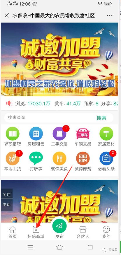 2、进入后,到商城,当然,里面有很多,你可以求职、买卖农机等等。