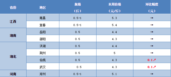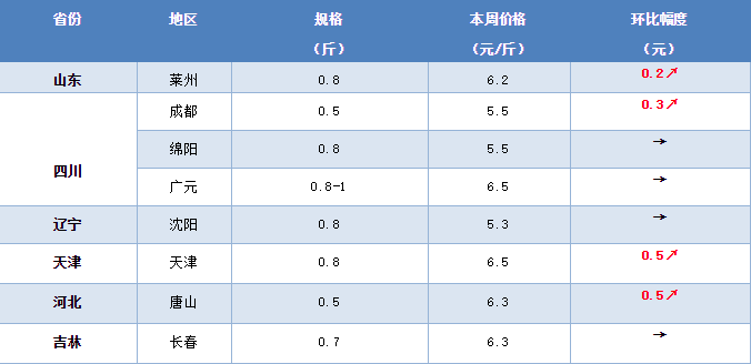 广东地区5两鱼不多,价格为14.5元/斤。市场上主流规格为2.7-2.8两,炮头3两的杂交鱼为主,3两多新鱼杂交价格比单性价格高0.4元/斤左右;福建地区价格依然坚挺。中鱼价格为13元/斤;湖北地区持续跌价,10天跌价2.5元/斤;浙江地区目前3两头新鱼价格为10.5元/斤;广西地区塘头价格波动不大,6寸筛价格为13.5元/斤。