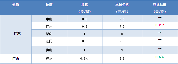 广东鳜鱼价格维持在23元/斤左右徘徊,而外省标桂也回落并稳定在23-25元/斤左右,全国鳜鱼价格一片低迷,上涨乏力,现在为消费淡季,市场走量较少,供大于求,预计本月鳜鱼价格上涨机会不大,或可能有小幅回落。