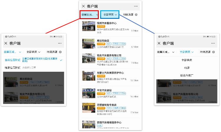 可在商家选择页面第一栏菜单选择“当前位置附近”或“指定位置附近”,页面会根据定位按距离展示,并优先展示与当事人投保公司有合作关系的商家。第二栏菜单可选择“4S店”或“综合修理厂”。点击选择好的商家,再点击“立即下单”即可预约服务商家。