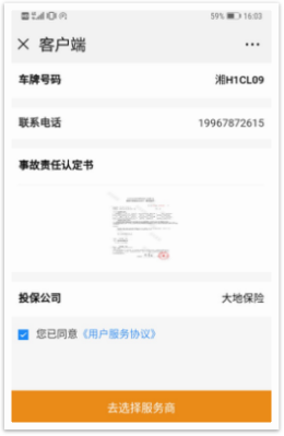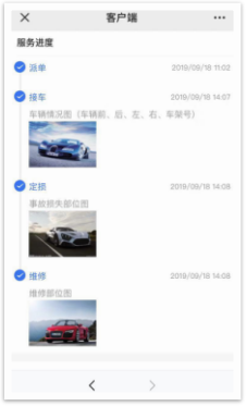 商家接单之后,根据用户需求安排接车,代理或指导用户办理定损、理赔以及修车服务,并将每一个环节的真实情况反馈在平台,用户可以随时知晓进度。