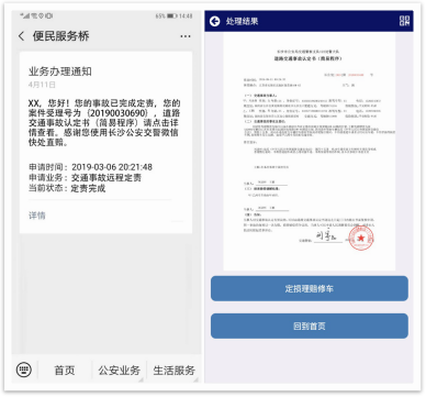 以往通过网上定责,群众很难与交警直接沟通,现在上线了“民警定责APP”系统,事故当事人提交定责信息后, 辖区交警中队民警将立即收到事故信息,及时与事故当事人联系沟通,并通过 “民警定责APP”系统,确定责任,大大缩短了定责时间。定责完毕后,便民服务桥会将定责信息及电子版事故认定书推送给当事人,同时双方当事人的手机短信也会收到。