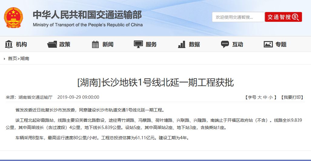 2019年9月30日湖南省发改委近日批复长沙市发改委,同意建设长沙市轨道交通1号线北延一期工程。