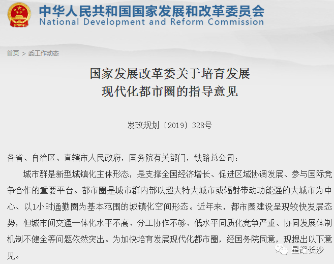 这是我国第一份以“都市圈”为主题的中央文件,标志着都市圈时代正式来临,大长沙都市圈应运而生。