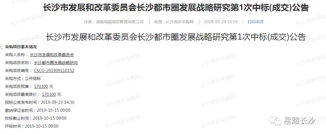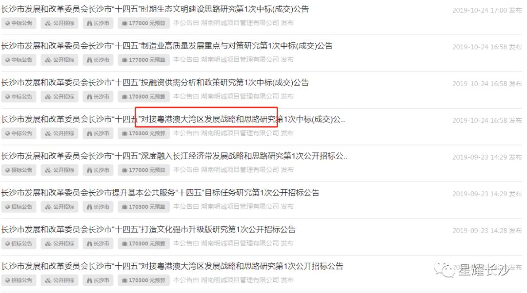 招标公告中提出了要落实“一带一部”战略、融于粤港澳大湾区、长江经济带、“4小时经济圈”等,除此之外,还发布了打造长沙都市圈发展战略研究招标公告。