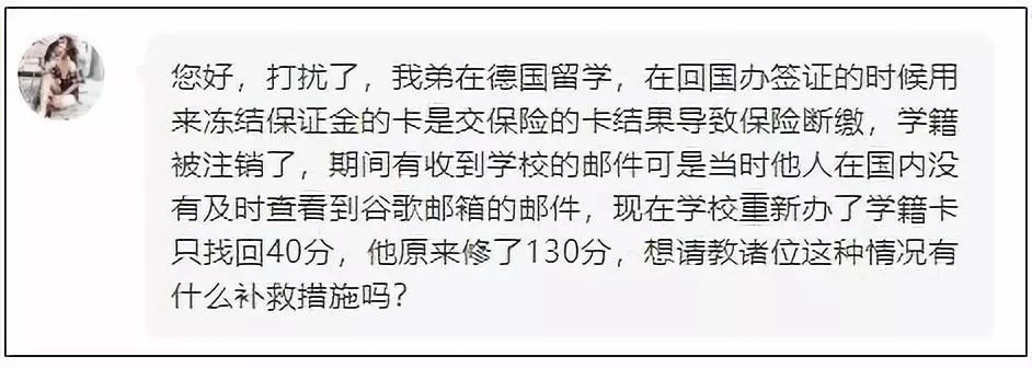 案例一:一位留德学生的姐姐在知乎上联系我们的账号“德国圈哥儿”,她表示弟弟回国期间没有及时看到谷歌邮箱的邮件(催缴保险费用),导致学籍被注销。经过与大学沟通,重新办了学籍卡。但只找回了40个学分,而这位同学原本已经修了130个学分…