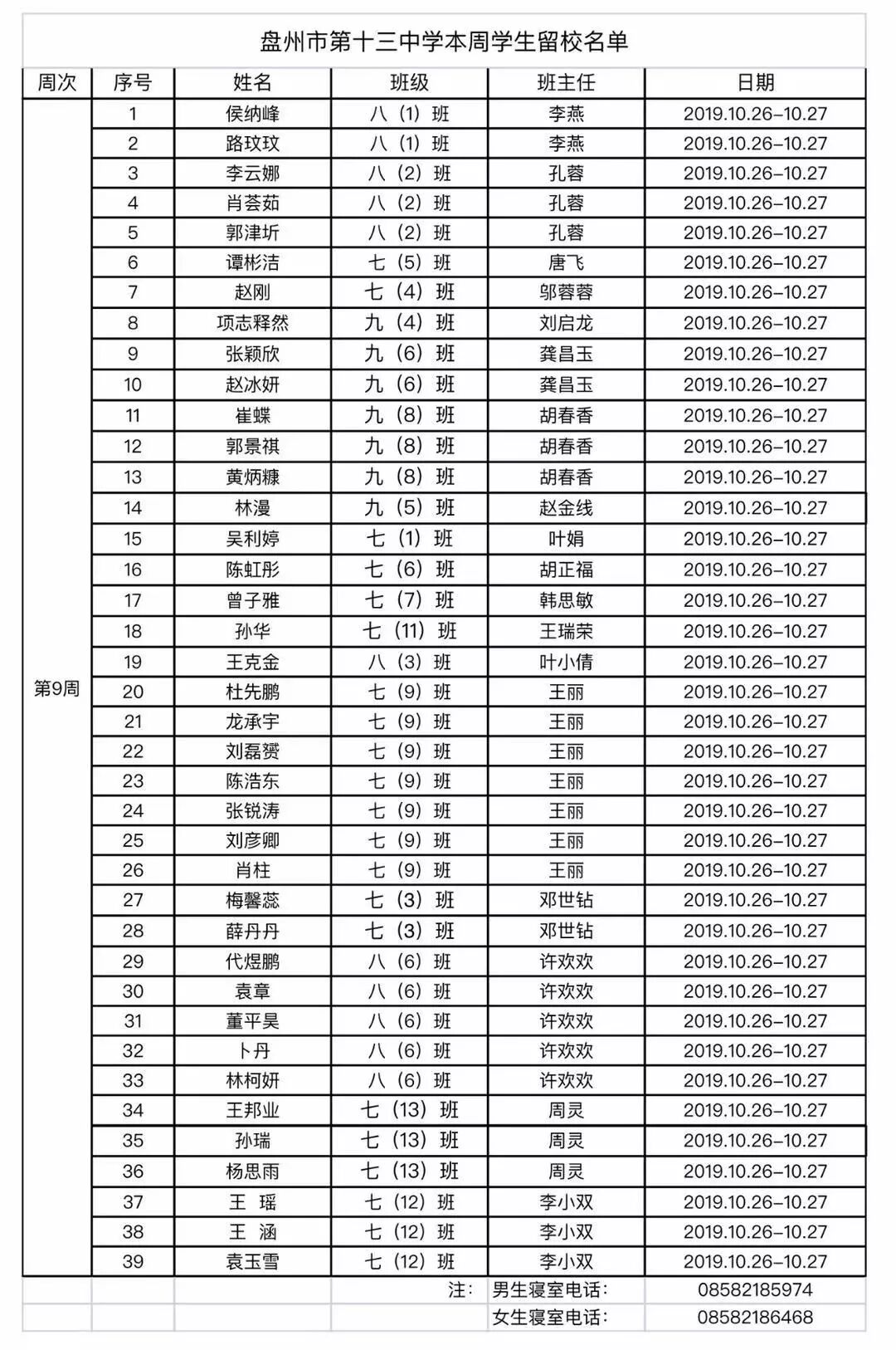 为方便学校管理,现将本周(2019年10月26-10月27日)留校学生名单公布如下,请各位家长朋友查看。